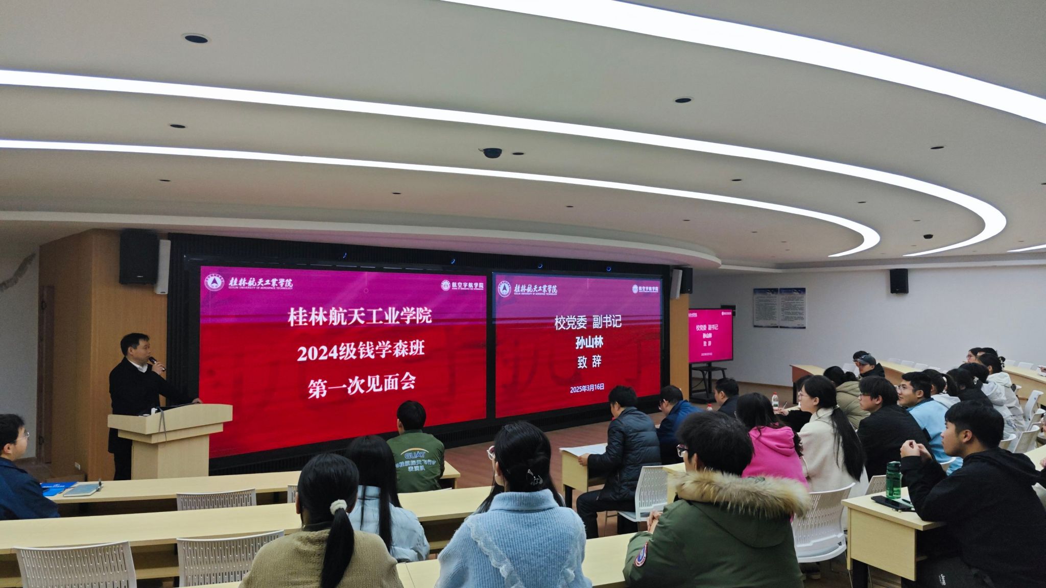 会议伊始,孙山林副书记介绍了钱学森先生生平事迹以及“钱学森班”成立的背景意义,强调我校“钱学森班”作为广西首个“钱学森班”,遵循着钱学森先生“集大成得智慧”的教育理念,是学校深入贯彻航天强国、科技强国、教育强国战略的关键举措,意图打造一个学术氛围浓郁、创新活力充沛的班级环境,为“钱学森班”学子提供更优秀的师资团队、更前沿的科教成果、更广阔的交流通道,帮助钱班学子实现德、智、体、美、劳全面发展,成为专业基础宽厚、发展潜力大、综合素质高、创新能力强的高端航天人才。