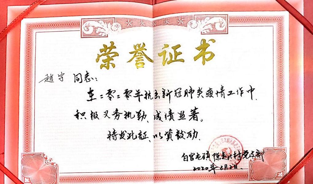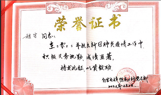 在日常防疫工作,他严格遵照疫情防控部门的要求,稳中求细,不留死角。在北方零下十几度的严寒下,为了弄清人员居住情况,做好消毒防护措施,赵宇同其他志愿者们逐一入户摸排弄清各村户居住情况,不厌其烦的反复提醒防控要求。在卡点站岗执勤中,严格把控,认真做好人员出入登记工作,量体温、去向登记、证明索取、车辆消毒、鞋底消毒等等,每一项工作都井然有序,不漏项、不马虎。他说:“虽然每天至少十二个小时的防疫任务,条件和过程都比较艰苦,但是想到自己能为国家的防疫事业贡献出自己的一份力,再辛苦也是值得的。”赵宇同学利用寒暑假时间连续三年在所在村担任防疫志愿服务者工作,服务时长总计超过300小时,连续三年被授予抗击新冠肺炎疫情工作荣誉证书。